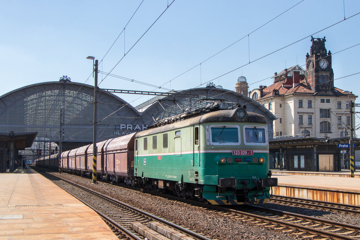 Praha hl.n. am 19. April 2019. Hin und wieder durchfährt auch ein Güterzug den Bahnhof. 123 029-1 war es an dem Tag.