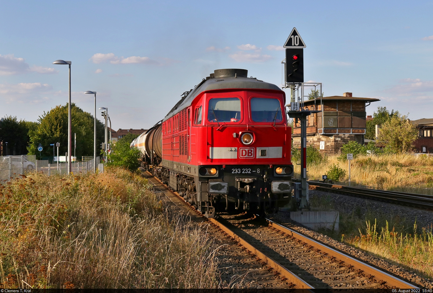 Nahgüterzug von Baalberge nach Magdeburg-Rothensee mit 233 232-8 (232 232-9 | 132 232-0) durchfährt als Umleiter den Bahnhof Güsten auf Gleis 3 Richtung Aschersleben.
