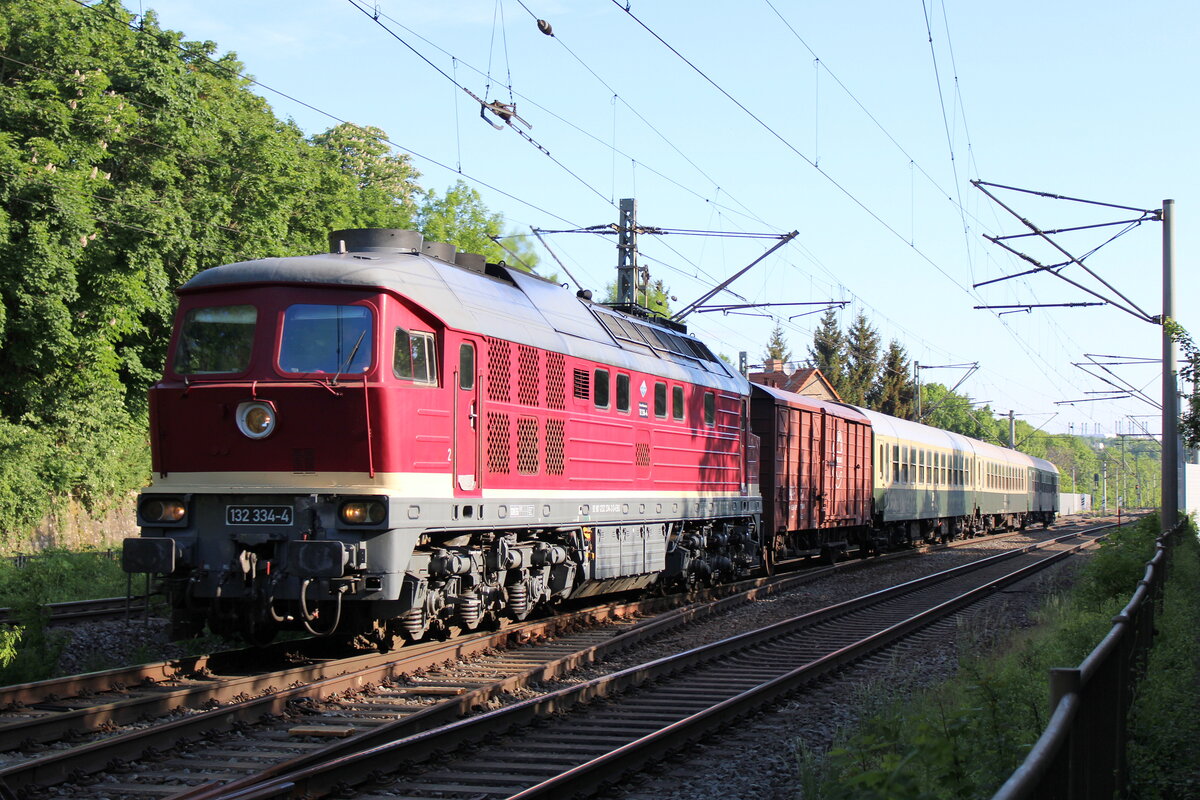 EBS 132 334-4 mit einem DLr nach Erfurt Gbf, am 21.05.2022 bei der Ausfahrt in Arnstadt Hbf. Im Rahmen der "Regenbogen-Tour" zugunsten krebskranker Kinder war der Sonderzug zuvor als "Regenbogen-Express" zwischen Arnstadt und Weimar unterwegs. Frank Thomas