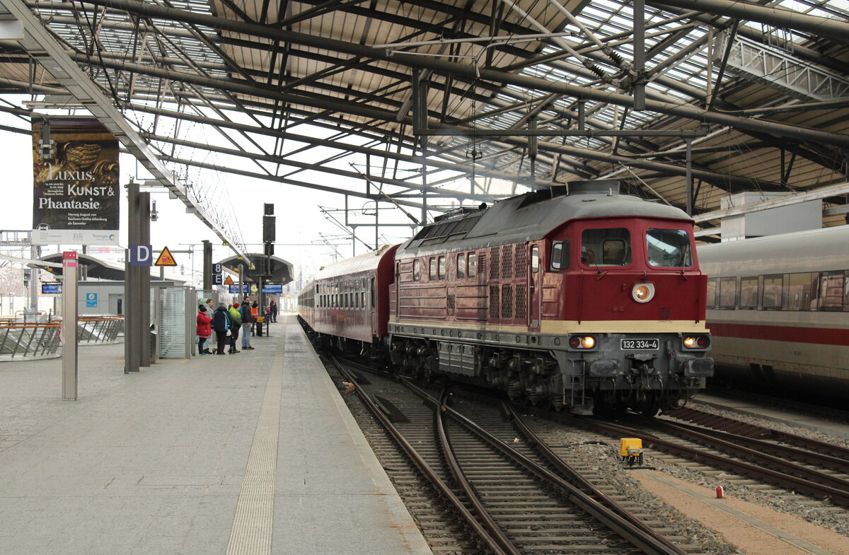 EBS 132 334-4 mit dem RE 26946 nach Zella-Mehlis, am 11.02.2023 in Erfurt Hbf. Anlässlich der Biathlon-WM in Oberhof bestellte die Erfurter Bahn diesen zusätzlichen RE50 bei der Erfurter Bahnservice GmbH. Frank Thomas