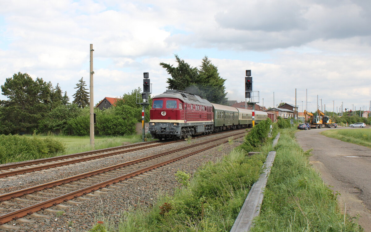 Am 13.07.2022 zog die EBS 132 334-4 von Karsdorf bis Erfurt Gbf einen Lokzug mit Ziel Opladen. Hier zusehen bei der Ausfahrt in Naumburg (Saale) Hauptbahnhof. Frank Thomas