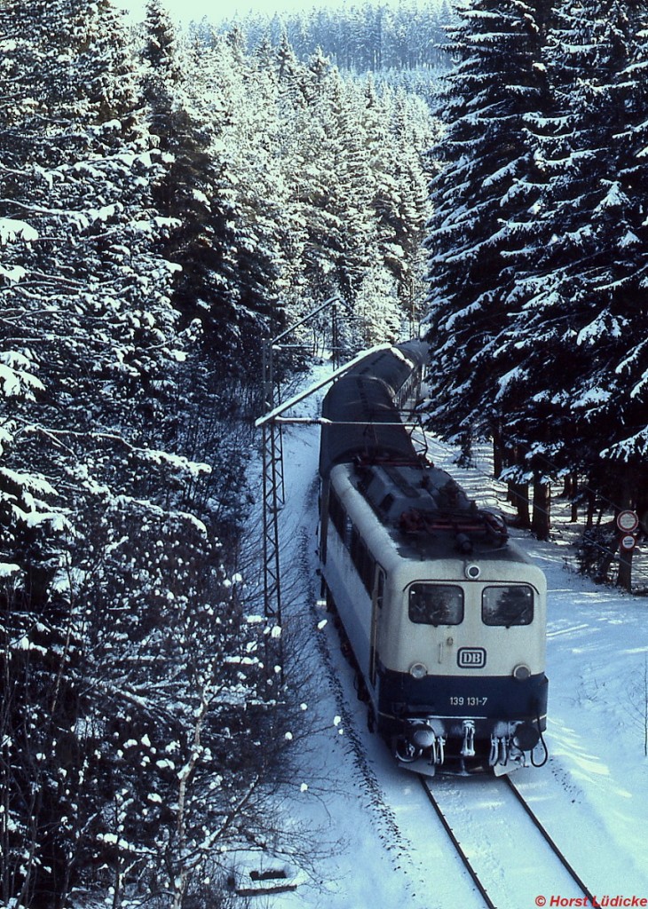 Im Februar 1983 ist 139 131-7 mit einem Nahverkehrszug von Seebrugg nach Freiburg am Windgfällweiher unterwegs