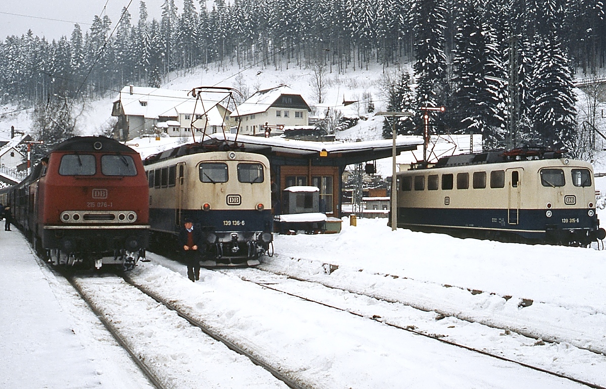 Hochbetrieb im Bahnhof Neustadt (Schwarzwald) im Februar 1982: 215 076-1 ist gerade mit einem Eilzug aus Donaueschingen angekommen. Nachdem sie abgekuppelt hat, wird 139 315-6 den Zug übernehmen, um ihn nach Freiburg zu befördern. Dazwischen noch 139 135-6 mit einem Nahverkehrszug von/nach Freiburg. Horst Lüdicke