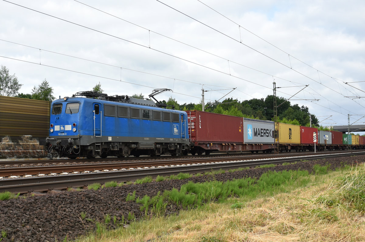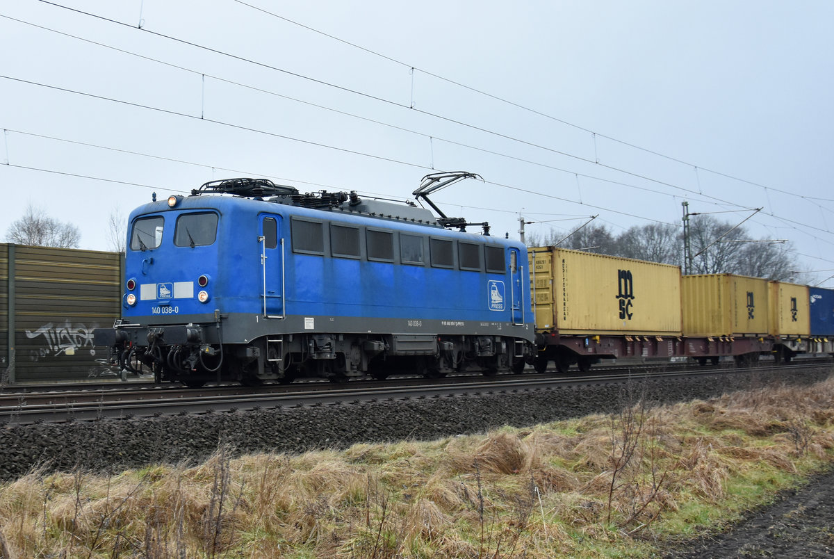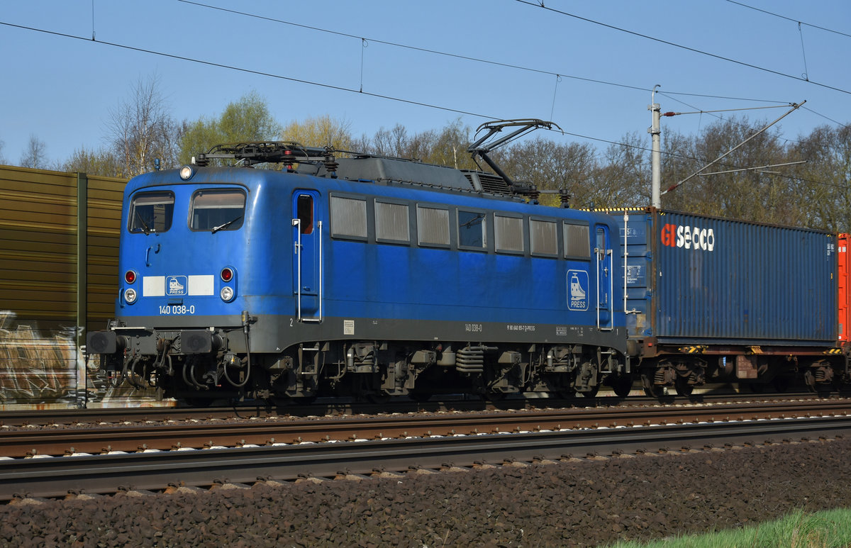 Diese schicke 140 038-0 der Press kam bei bestem Frühlingswetter mit Container im Schlepp aus Richtung Hamburg. 17.04.2018, Höhe Bardowick. Stefan Bree