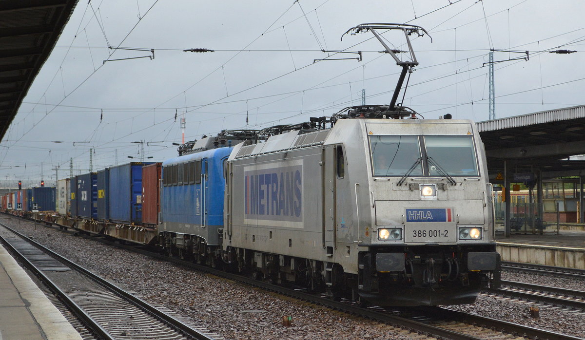 METRANS Rail s.r.o., Praha [CZ] mit "386 001-2" [NVR-Nummer: 91 54 7386 001-2 CZ-MT] mit der PRESS "140 038-0" (NVR-Nummer: 91 80 6140 851-7 D-PRESS) und Containerzug am Haken am 16.10.19 Durchfahrt Bahnhof Flughafen Berlin Schönefeld.