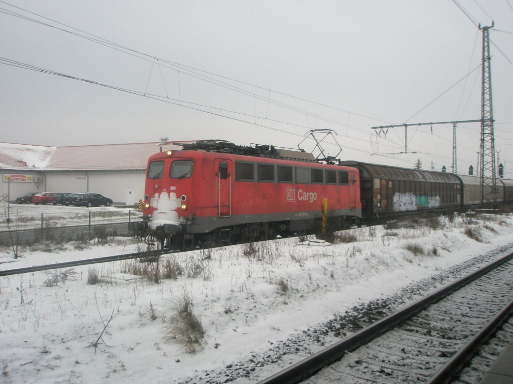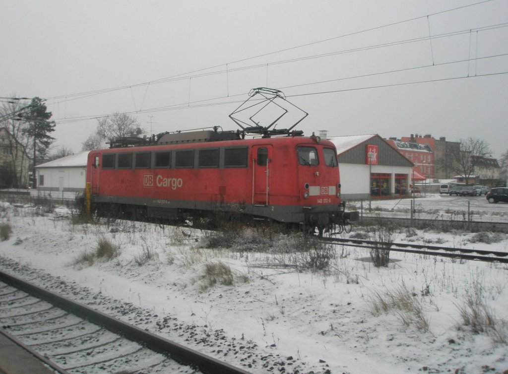 Hier 140 112-6 mit einem Güterzug in Richtung Berlin, bei der Ausfahrt am 23.12.2009 aus Angermünde.