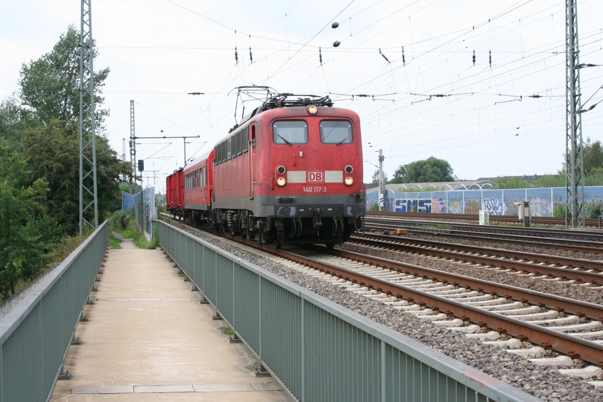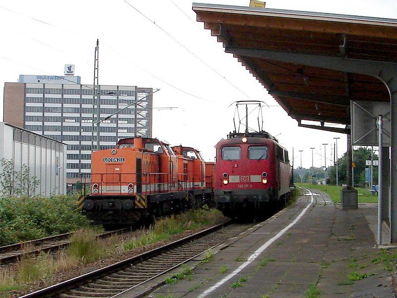 140 117-3 mit einem Phosphatkesselzug, auf dem Weg nach Mukran. Auf dem Nebengleis warten zwei Lok`s von Locon auf ihre Weiterfahrt. (Stralsund am 28.06.07) Jörg Trutwig