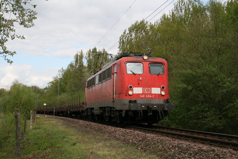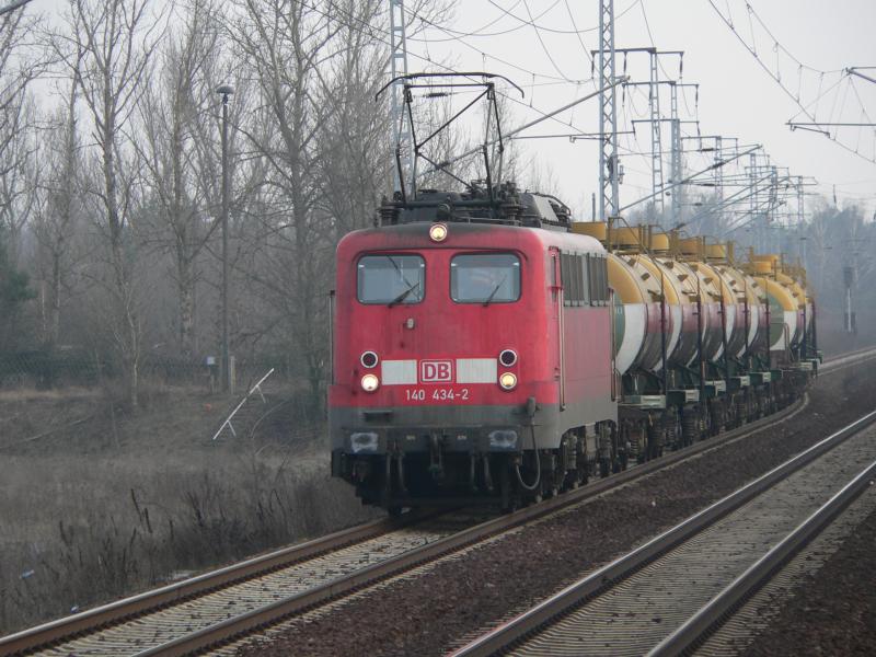 140 434-2 bringt hier einen Farbtupfer in die noch graue Landschaft. Aufgenommen an der Strecke zwischen Wuhlheide und Biesdorf am 25.3.05 Thomas Wendt