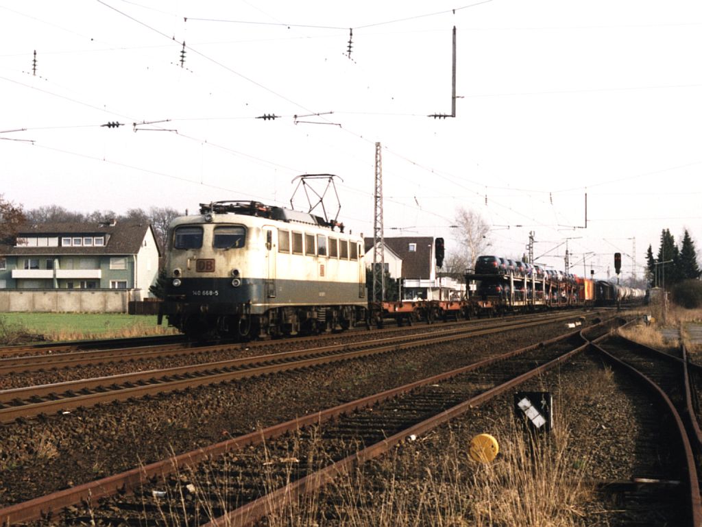 Ausfahrt der BR 140 668-5 aus Beuel Bf, Höhe Limperich-Nord, am 19.03.2003