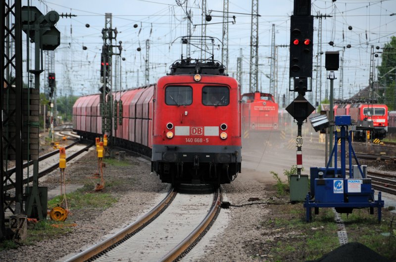 Mächtig viel Staub wirbelt 140 668-5 bei Durchfahrt Darmstadt Hbf mit ihrem Güterzug auf. (Mai 2009).