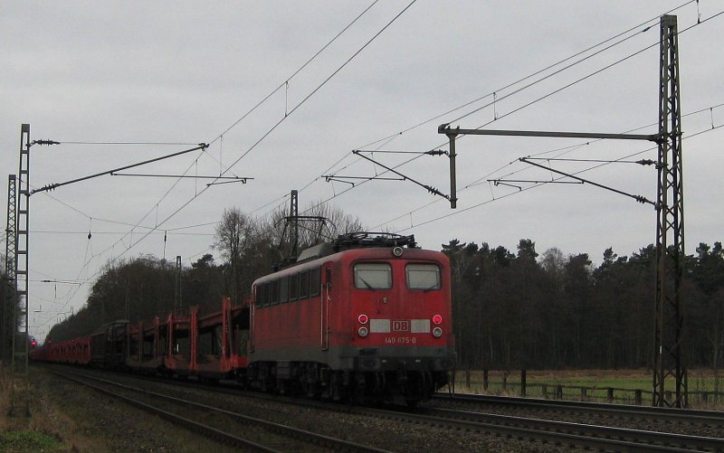140 675-0 durchfährt am 31.01.09 mit einem leeren Autozug Radbruch. Da der Tf an diesem Tag wohl keine Lust hatte Fotografiert zu werden, zog er den Sonnenschutz herunter und stellte an seinem Tfz das Dreilicht Spitzensignal auf zwei rote Schlusslichter um. Lars Backhaus