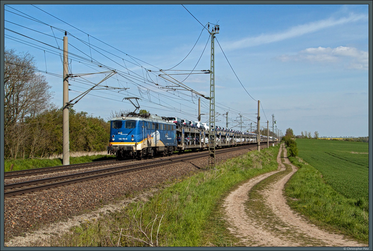 ebb  140 761-8  (NVR: 91 80 6 140 761-8 d_EVB ) mit PKW-Transportzug am 14.05.20 Bf. Berlin-Hohenschönhausen.