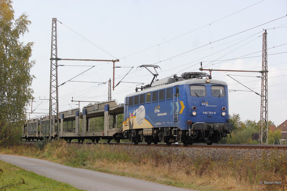 140 761-8 der Mittelweserbahn GmbH (MWB), Teil der Eisenbahnen und Verkehrsbetriebe Elbe-Weser GmbH (evb), als Tfzf fährt in Zscherben auf der Bahnstrecke Halle–Hann. Münden (KBS 590) Richtung Teutschenthal.