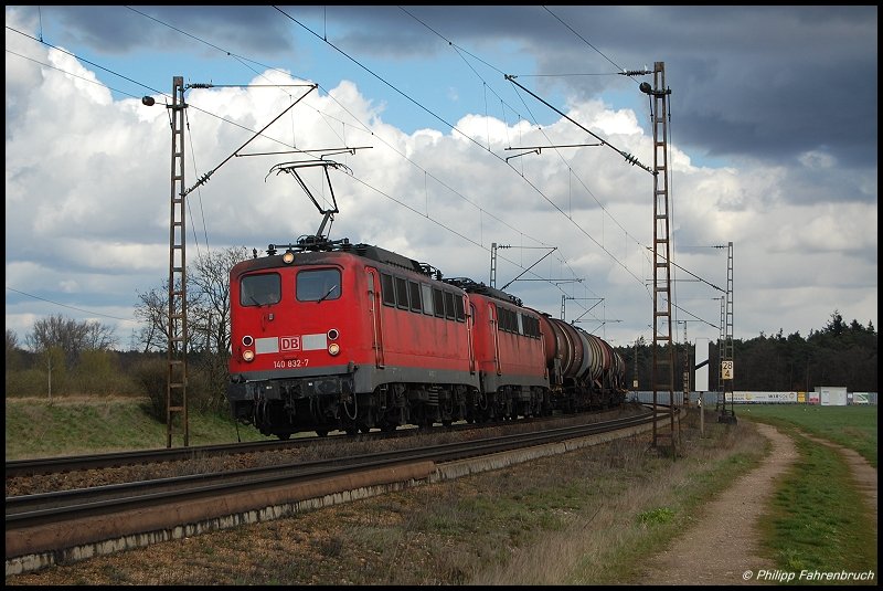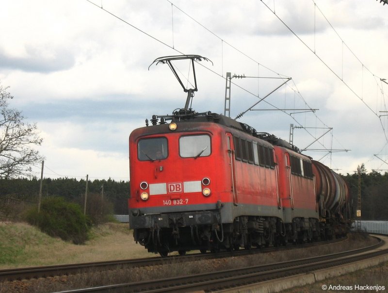 140 832-7 & 140 759-2 bespannen am 25.03.08 einen Kesselwagenganzzug über die Rheintalbahn (KBS 702), aufgenommen kurz vor Waghäusel am Km 28,0 mit Fahrtrichtung Graben-Neudorf. P.F.