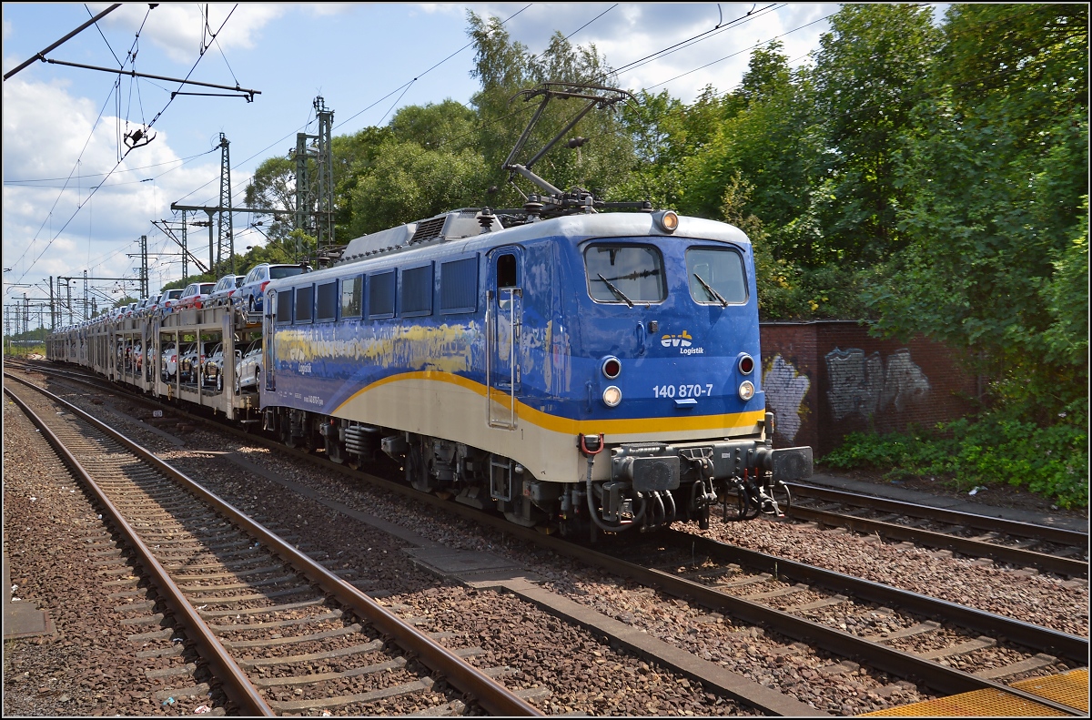 Mit einem kurzen und leeren Autotransportzug aus dem Hamburger Hafen fuhr am Abend des 18.07.2019 die 140 870-7 von der EVB durch den Bahnhof von Hamburg Harburg in Richtung Rangierbahnhof Maschen. Tobias Schmidt