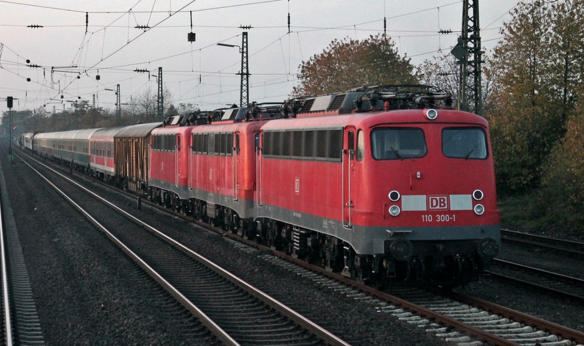 Am 16.11.2013 stand 110 300-1 zusammen mit 110 210-2 und der ältesetn E10 in Deutschland, die 115 152-1 mit vielen Reisewagen in nördlichen Teil des Rangierbahnhofs Koblenz-Lützel. In der Mitte des Zuges wurde ebenfalls die grüne 141 055-4 mit eingereiht.