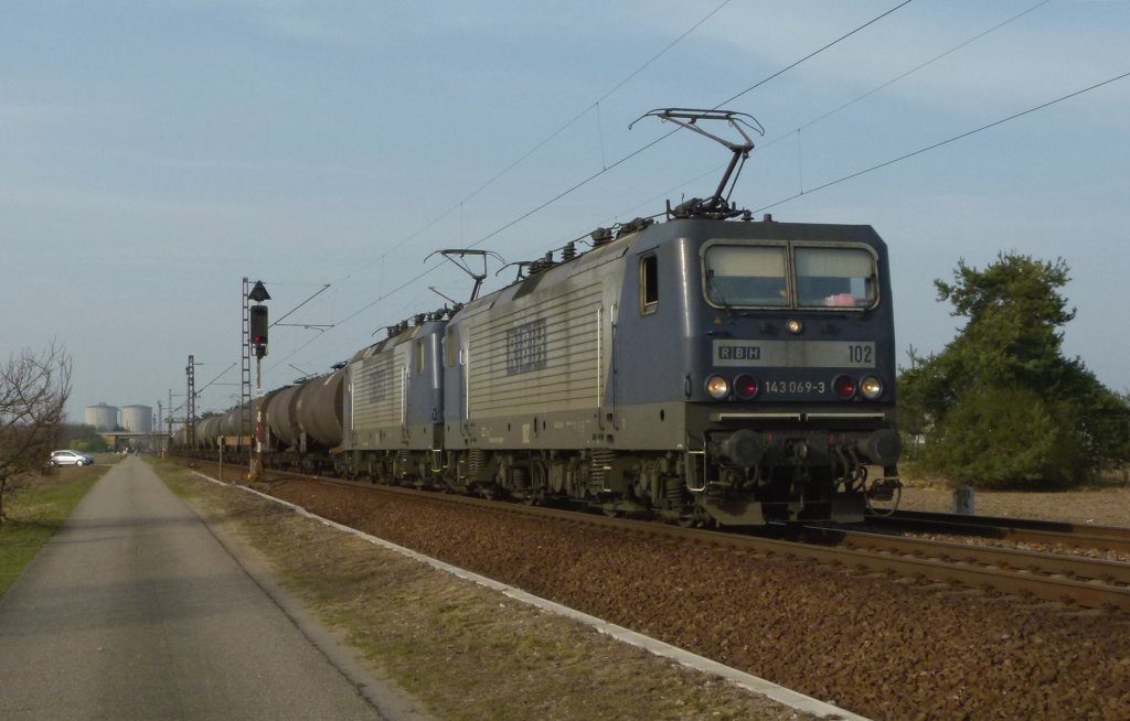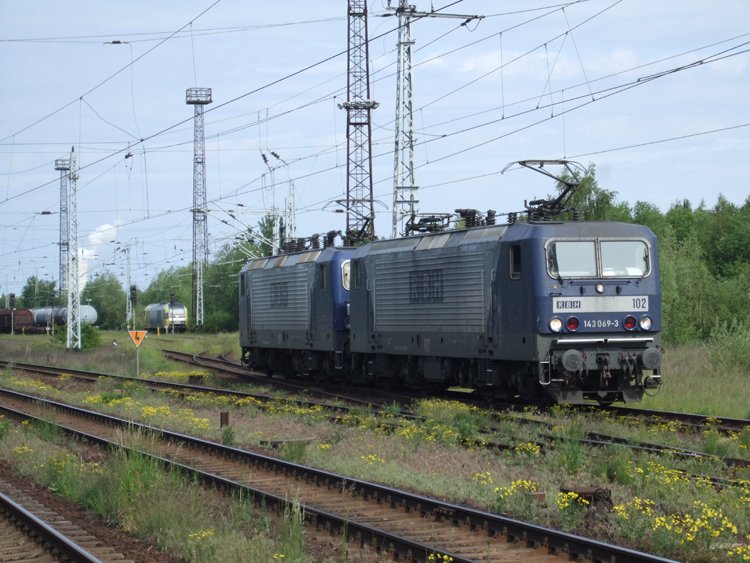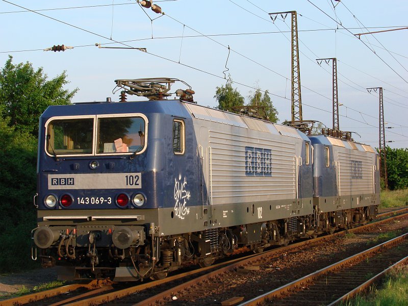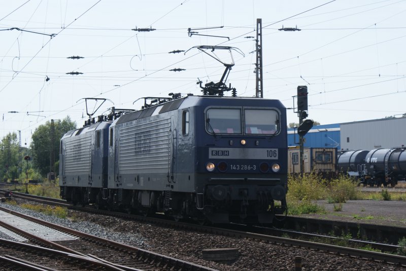 143 069-3(RBH Lok 102)und 143 286-3(RBH Lok 106)werden in Kürze den RBH-Kesselzug63900 von WRS nach Stendell im Bahnhof Rostock-Seehafen bespannen.Aufgenommen am 24.05.09 am Hp Rostock-Dierkow. Stefan Pavel