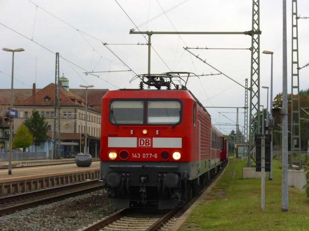 143 077-6 hat am 24. September 2010 mit einem RE aus Nürnberg Hbf den Endbahnhof Kronach auf Gleis 4 erreicht.