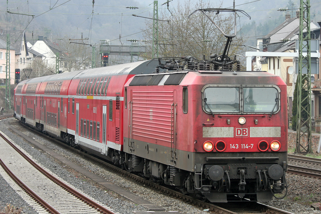 Die 143 114-7 zieht den RE2 von Koblenz nach Frankfurt im Sandwich in Boppard HBF ein am 30.03.2011