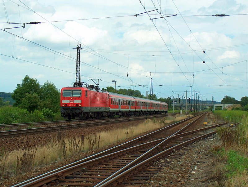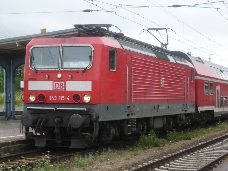 143 115-4 mit Regionalbahn Falkenberg/Elster-Lutherstadt Wittenberg-Dessau-Bitterfeld-Halle/Saale Hauptbahnhof kurz vor Abfahrt in Falkenberg/Elster (16.07.2008) Uwe Wüstenhagen