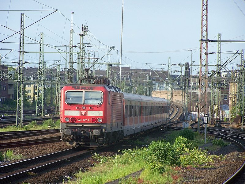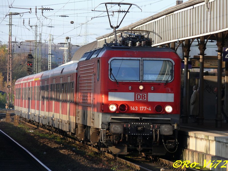 143 177 (9180 6 143 177-4 D-DB) trägt deutliche Spuren von Eis und Schnee im Berreich der Puffer. Am Morgen des 06.01.2009 schiebt sie einen Zug der Linie S1 nach Düsseldorf Hbf.