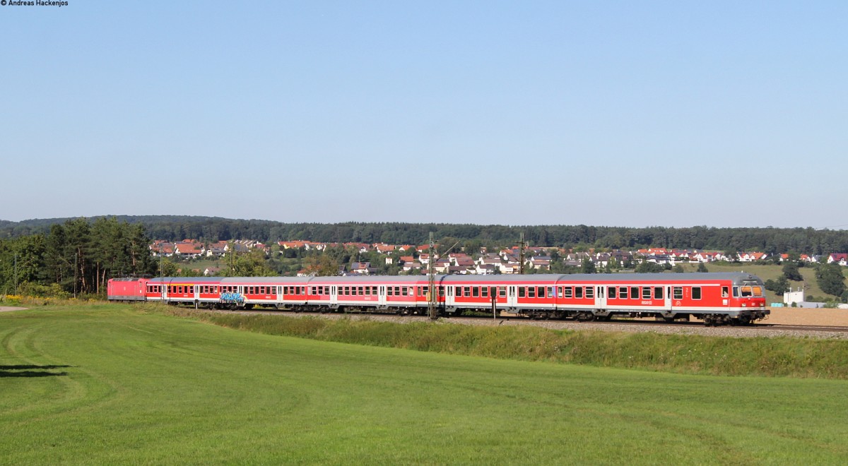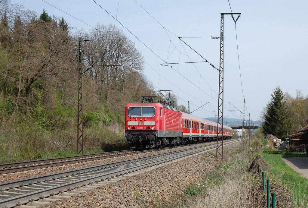 Da ich mit meinem bisherigen Standort kurz vor Göppingen nicht so zufrieden war, machte ich mich auf die Suche nach einem neuen. Dieser fand sich in der nahen Umgebung des alten und so konnte gleich 143 195-6 mit einem aus n-Wagen gebildeten Regionalzug nach Plochingen kurz vor Göppingen aufgenommen werden. Pascal Ost