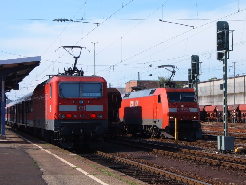 Startklar steht 152 092-3 mit ihrem FZT 56080 von Aalen nach Stuttgart Hafen auf Gleis 7. Gleis 6 ist mit einem abgestellten Schotterganzzug belegt. Auf Gleis 5 ist 143 195-6 gerade mit einem RegionalExpress aus Stuttgart HBF im Aalener Bahnhof angekommen. Datum: 14.06.07. P.F.