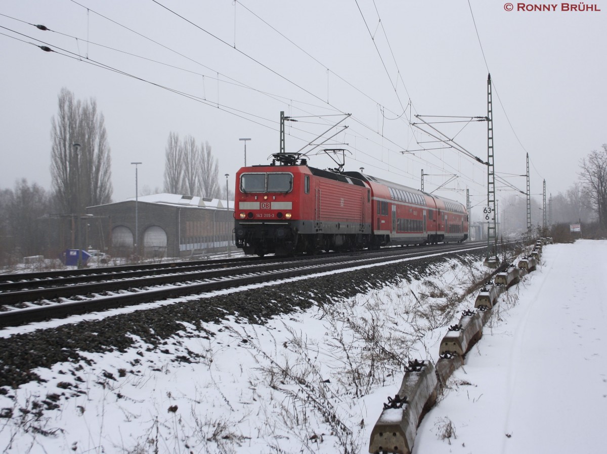 Die 143 205-3 durchfährt am 07.02.2015 mit dem RE 4769 (Hof Hbf - Dresden Hbf) den Haltpunkt Zwickau-Pölbitz seinen nächsten Halt in Glauchau (Sachs) entgegen. Matthias Hartmann