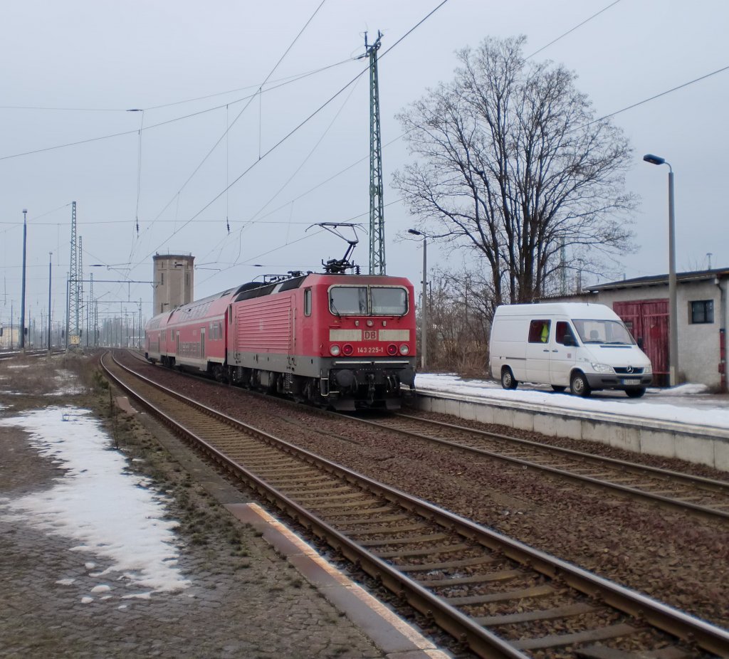 143 225-1 mit dem RE2 (RE 38139) nach Königs Wusterhausen in Rathenow. Dieser Zug bestand aus alten Dostos "DBuza 747.4 (140km/h), DBuza 747.4 (140km/h), 749.2 (120km/h) und DABbuzfa 760 (140km/h)". 12.10.2010 Stephan Kemnitz