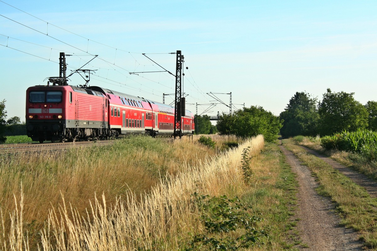 143 236-8 mit einer RB von Freiburg (Breisgau) Hbf nach Neuenburg (Baden) am Morgen des 03.07.14 westlich von Hügelheim.