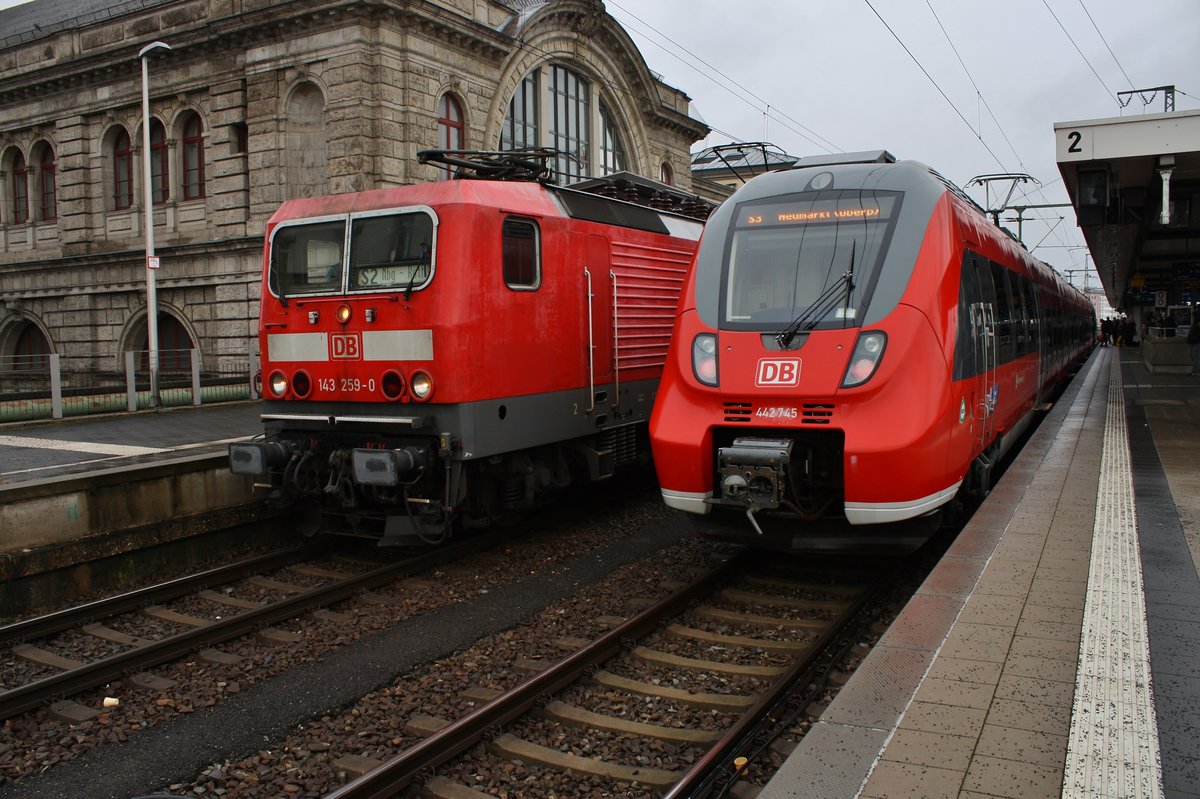 143 259-0 trifft am 28.12.2017 mit der S2 von Altdorf(b Nürnberg) nach Roth im Nürnberger Hauptbahnhof auf 442 745-6 als S3 nach Neumarkt(Oberpf).
