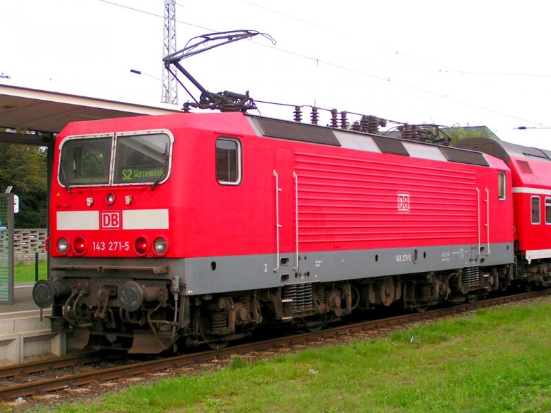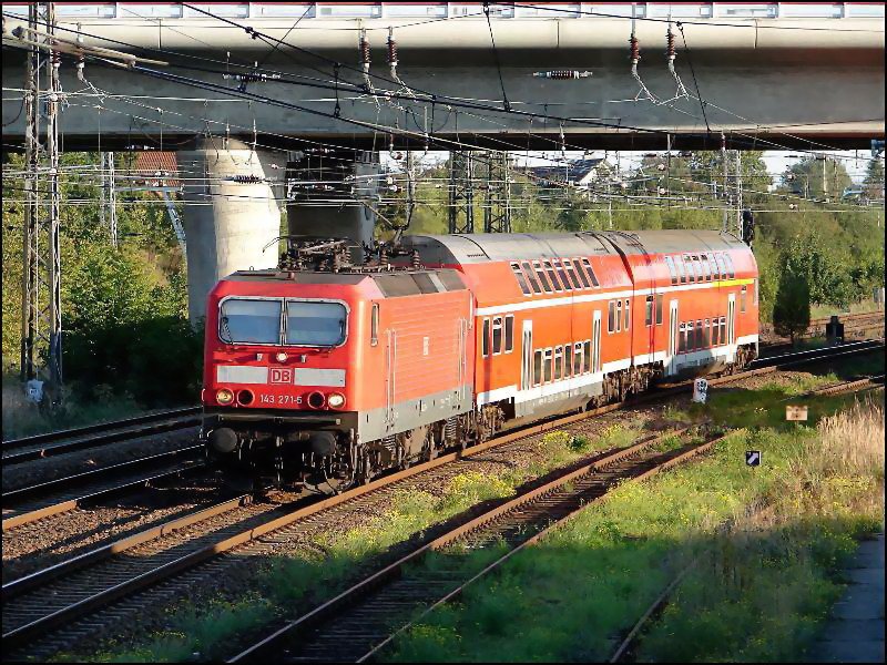 143 271-5 mit RB33310 aus Sassnitz, bei Einfahrt in den Bhf Stralsund-Rügendamm. am 07.04.2007. Zu sehen auch die Pylone der neuen Sundquerung. Die feierliche Freigabe der Brücke findet zwischen dem 19- 21 Oktober 2007 statt. (Volksfest) Jörg Trutwig