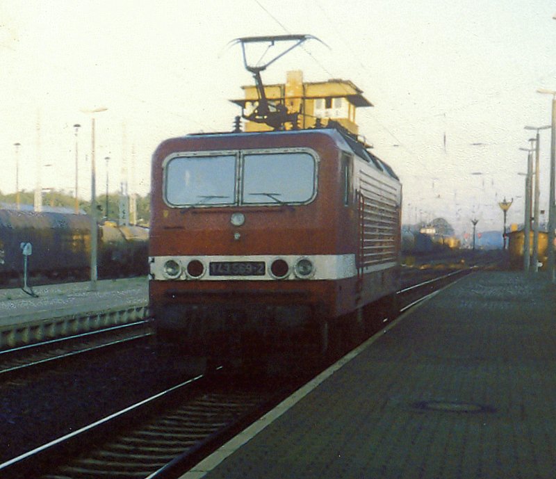 Lokwechsel in Hoyerswerda. 143 569-2 setzt sich an den RE 3022 Görlitz-Leipzig, den 232 400-8 bis hier am Haken hatte. Bild von August 1997. Mike Schulz