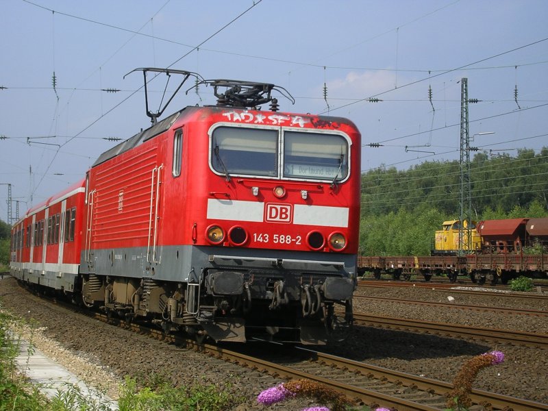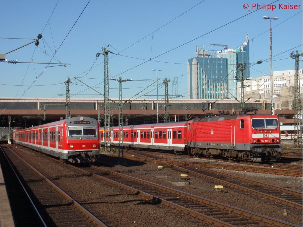 Im Rennen um den schnellsten Start vom Düsseldorf Hauptbahnhof liegt 143 588-2 mit ihrer S8 Ganitur rechts vor der S6 die aus dem HBf gedrückt wird. Das Bild entstand am 4.6.2010. Philipp K