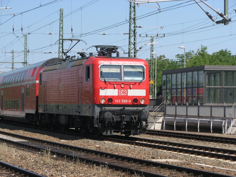 143 589-0 hat am 27.7.2009 den RE 17455 von Leipzig Hbf nach Dresden Hbf gebracht. Wegen der Bauarbeiten in Dresden-Neustadt und Dresden-Mitte musste dieser über die S-Bahn-Gleise umgeleitet werden und kommt daher auch am Gleis 18 an. Um die nachfolgende S-Bahn nicht zu behindern muss er das Gleis schon nach kurzer Aufenthaltszeit wieder räumen. Christopher Pätz