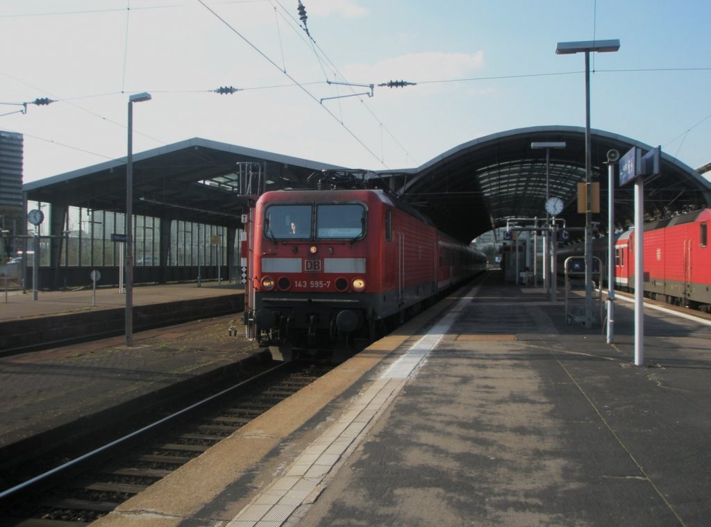 Hier 143 595-7 mit einem RE16 von Reichenbach(Vogtl.) ob Bf. nach Leipzig Hbf., bei der Einfahrt am 22.4.2011 in Lepzig Hbf.