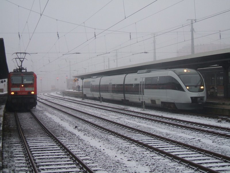 Dortmund Hbf., links die BR 143 600-5 mit S4 nach Unna ,diese S-Bahn ist im Dortmunder Hbf. normalerweise nicht anzuteffen, in der Mitte nähert sich ein SLK ,rechts die NordWestBahn ,in grau ,vielleicht neues Outfit ?? als RB 43 nach Dorsten, vom Typ Talent VT 2 08.(20.12.2007)