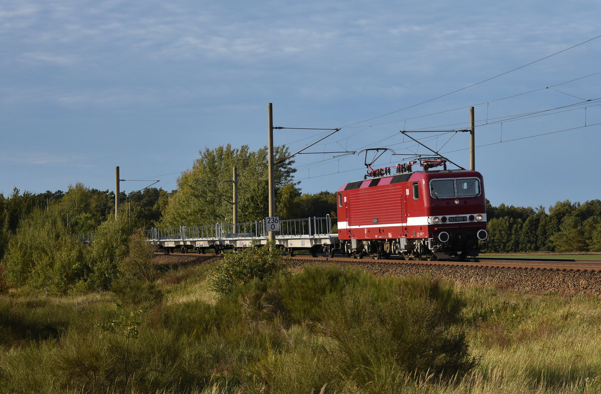 DeltaRail mit der schicken 243 650-9 / 143 650-0 und einem leeren Autozug von BLG Autorail, unterwegs in Richtung Hagenower Land. 3km östlich von Büchen, 08.10.2018. Stefan Bree
