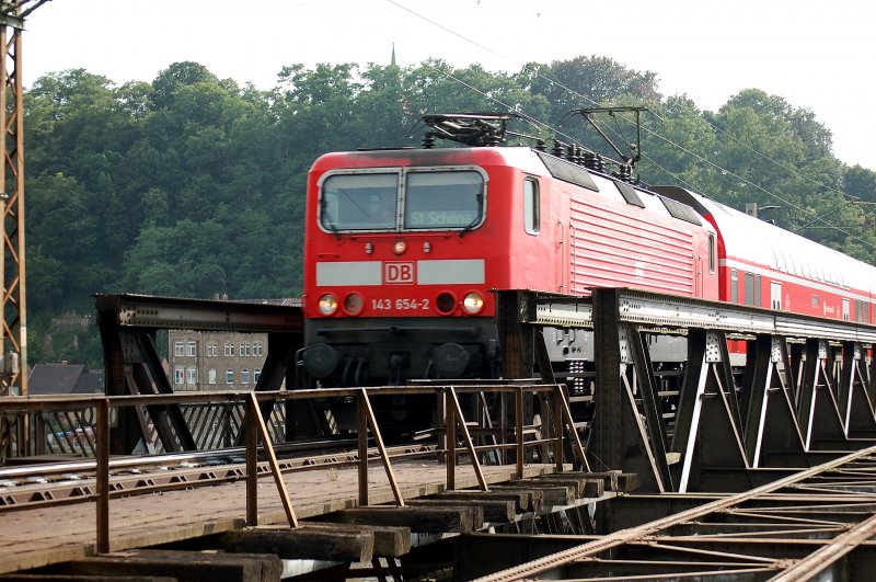 16.07.2008 143 654-2 mit S1 auf der Elbbrücke in Meißen.