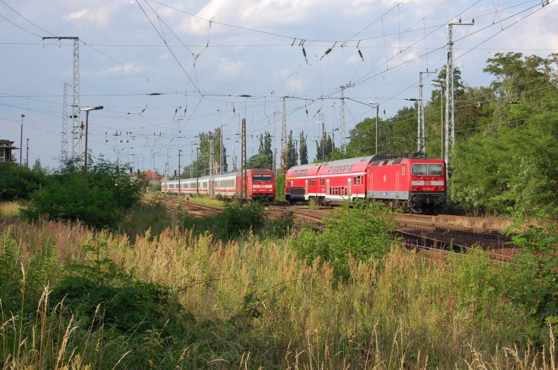 Begegnung in Elsterwerda am 25.06.2007, 101 126-1 mit EC 179 nach Dresden und 143 654-2 mit RB 31 nach Elsterwerda-Biehla.