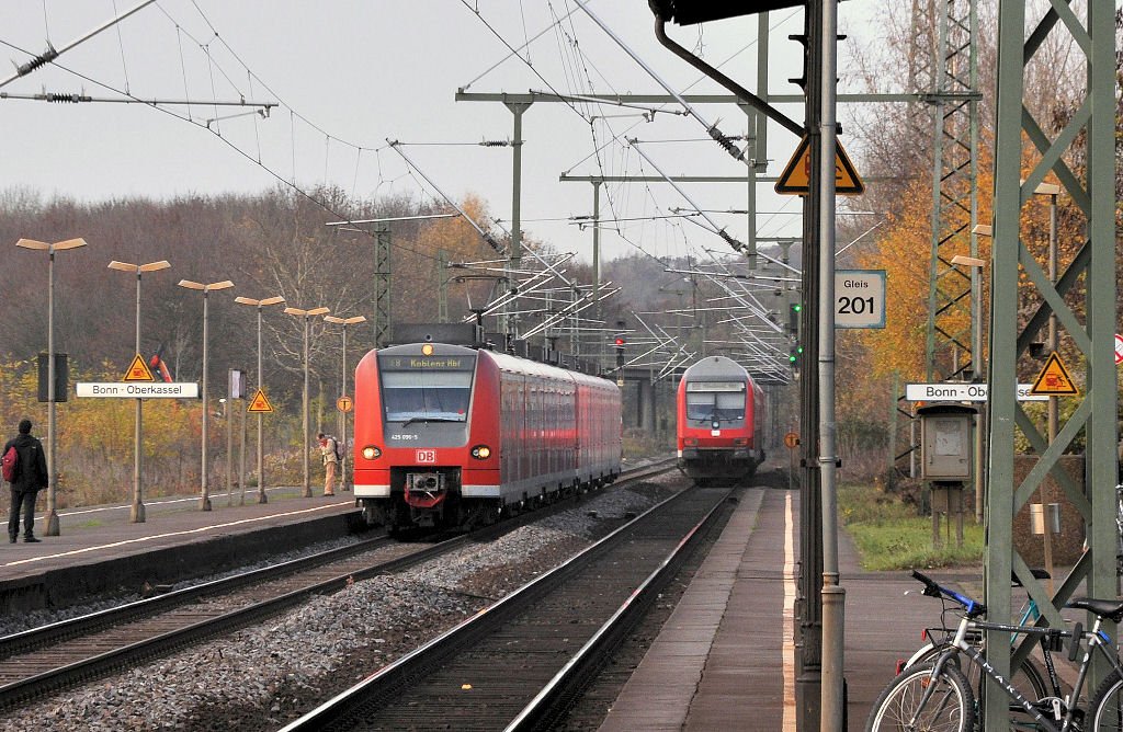 Ein- und Ausfahrt am Bahnhof Bonn-Oberkassel. 143 825-8 verläßte den Bahnhof Richtung Köln. 425 096-5 kurz vor dem Halt und anschließender Weiterfahrt nach Koblenz - 20.11.2009
