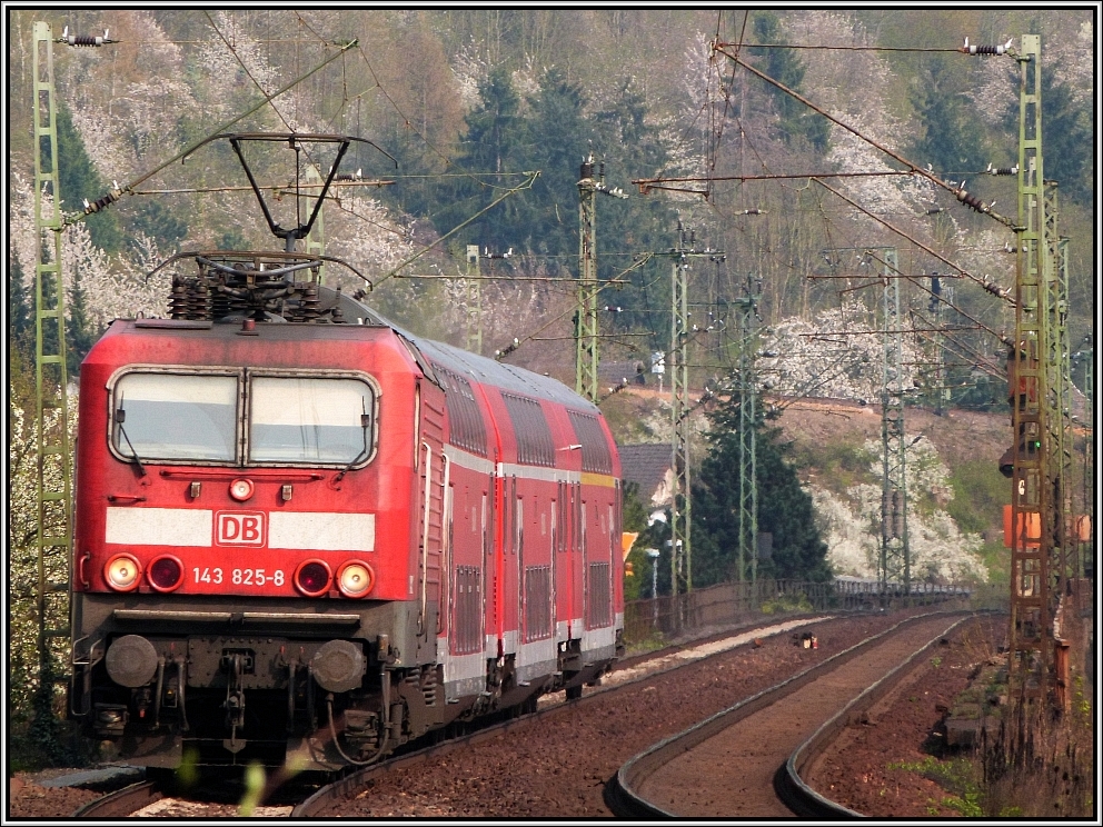 Hier trifft man sie noch an ,die 143 825-8 im Regional Express Verbund auf der rechten Rheinschiene bei Erpel. Bildlich festgehalten im April 2013.