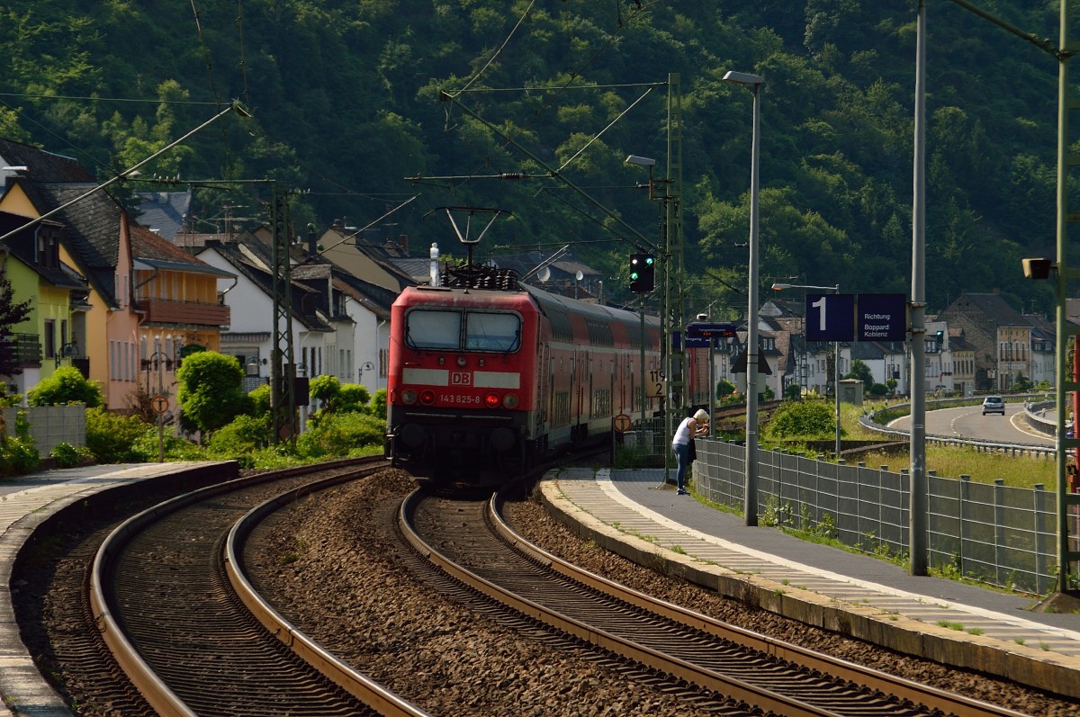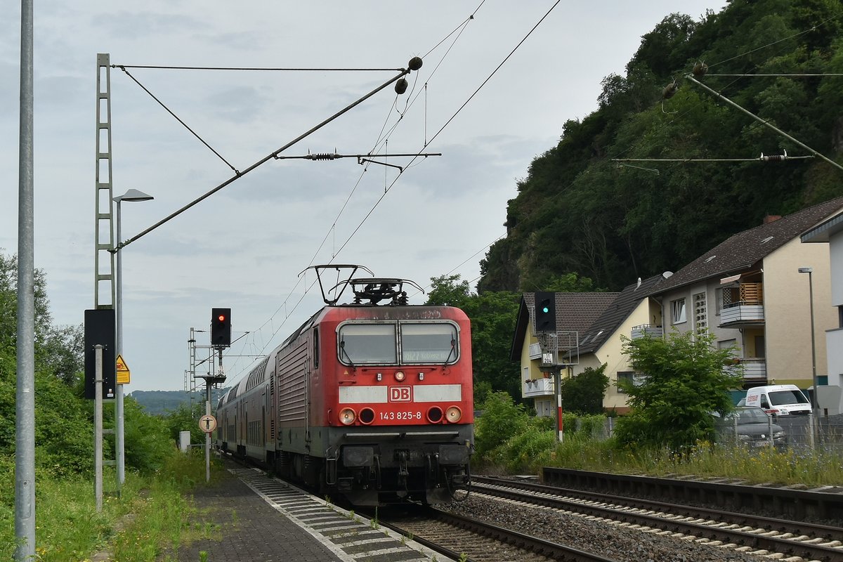 Nachschuß auf ein Sandwich nach Koblenz in Hirzenach....143 825-8 schiebt am Zugschluß. 2.6.2014
