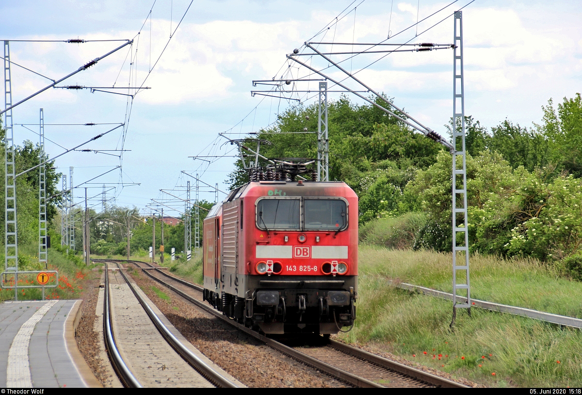 Nachschuss auf 143 825-8 DB, die mit Zuglok 146 225-8 von DB Regio Baden-Württemberg, mit Werbung für das Baden-Württemberg-Ticket, den Hp Zscherben auf der Bahnstrecke Halle–Hann. Münden (KBS 590) Richtung Halle (Saale) durchfährt. [5.6.2020 | 16:18 Uhr]