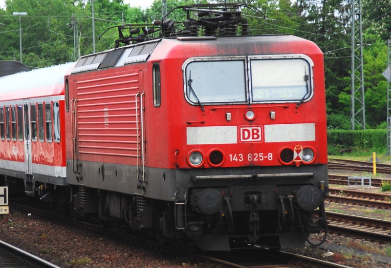 Die 143 825-8 fährt energiesparend neuen Jobs entgegen. Hier hängt sie am Ende eines Zuges mit diversen unbesetzten Wagen, die vermutlich von einer Wartung zurück kamen. Gezogen wurde dieser Zug von der 115 346-9 am 03.05.2009.