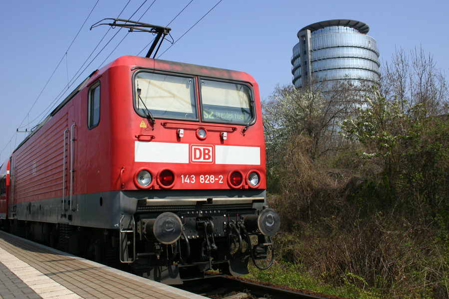 143 828-2 ist mit der S-2 in Dresden-Flughafen angekommen und fährt nach kurzen Aufenthalt zurück nach Pirna. Aufgenommen am 13.2.2009. Christopher Pätz