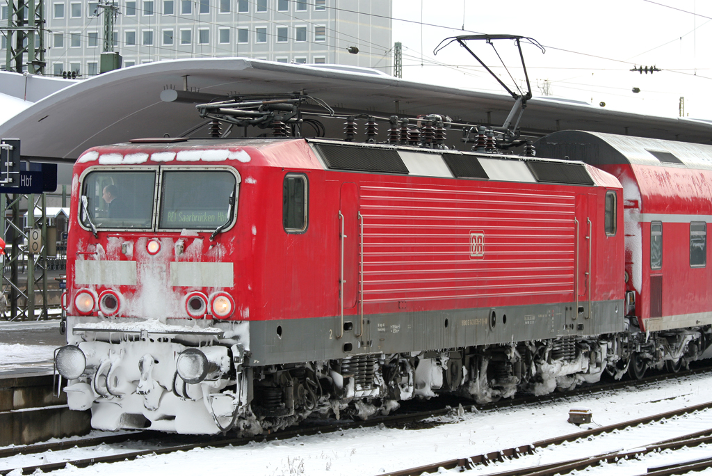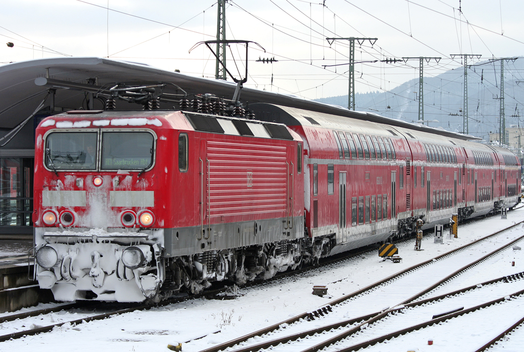 Die verschneite 143 835-7 steht mit dem RE1 nach Saarbrücken in Koblenz HBF am 18.10.2010