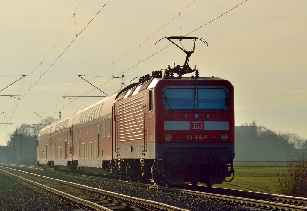 Nachschub ins Gegenlicht leistet die 143 835-7 bei einer RB 27 nach Mönchengladbach am Dienstag den 5.3.2013