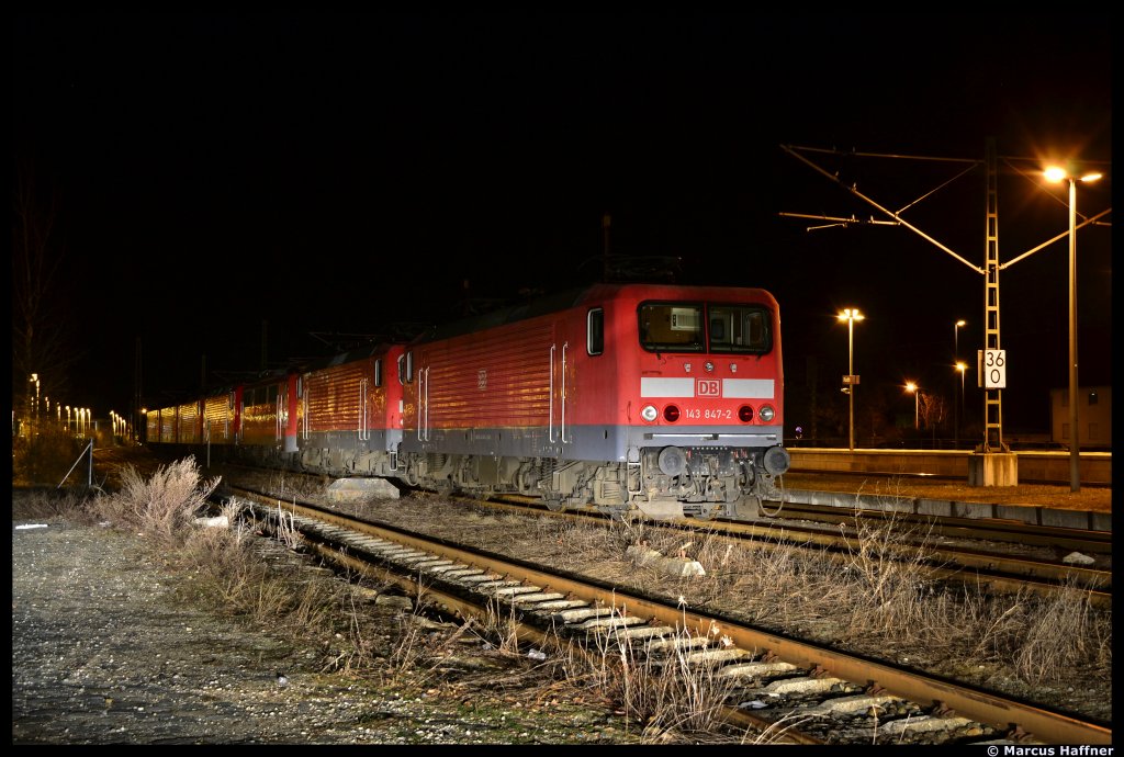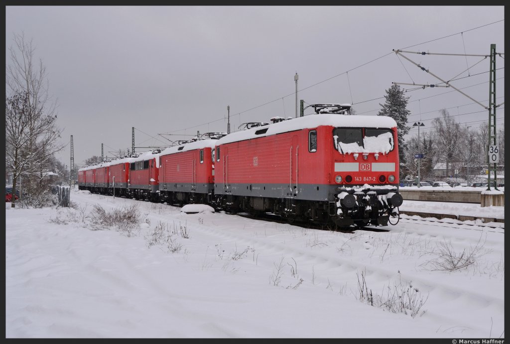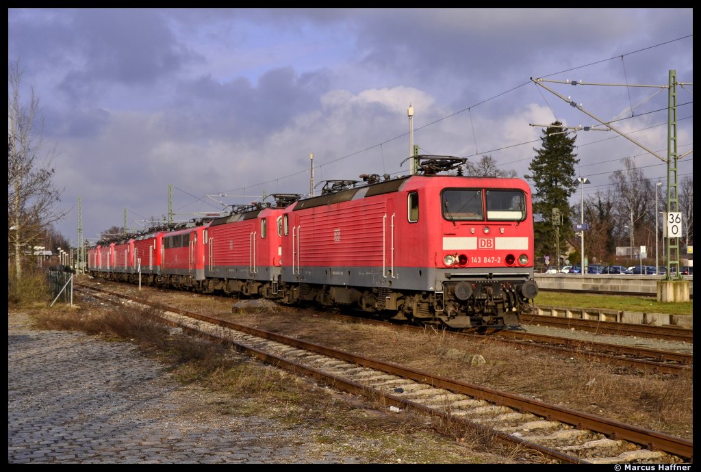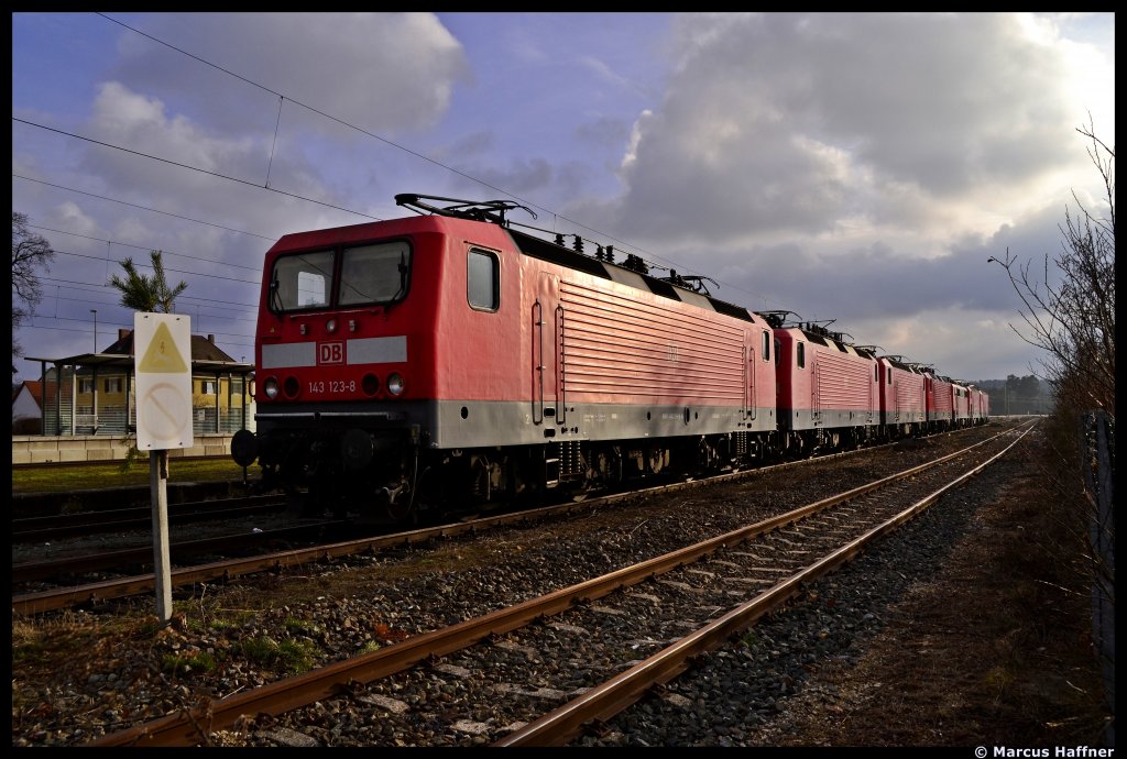 Genau handelt es sich um die 143 847-2, 143 652-6, 111 205-1, 143 659-1, 143 094-1, 143 895-1 und 143 123-8 (von vorne, nach hinten).