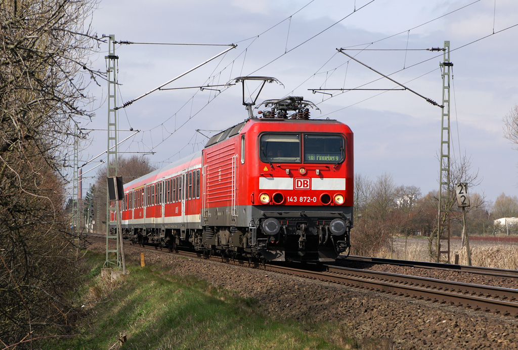 143 872-0 mit einer RB nach Pinneberg am 3.04.2010 bei Tornesch.